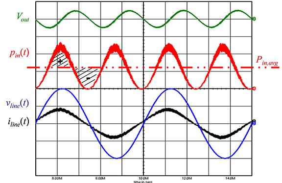 Figure 1 shows the line current (black trace) and the line voltage (blue trace) as a function of time. As a result of the PFC function, both of them are sinusoidal. Thus, the power provided to the load has the shape of a square sinusoid as shown by the red trace. Now, as suggested by the red dashed line, the output power is generally constant and the provided power matches the load demand in average. There are periods of time for which the PFC stage provides more power than needed (see “+” sign area) and the output capacitor absorbs this excess of energy. On the other hand, a second phase follows when the PFC stage supplies less power than necessary (see “-” sign area) and the output capacitor discharges to compensate the lack of energy.  The output voltage consequently (green trace) exhibits a ripple at twice the line frequency (typically 100 Hz in Europe, 120 Hz in US). This low-frequency ripple is inherent to the PFC function.