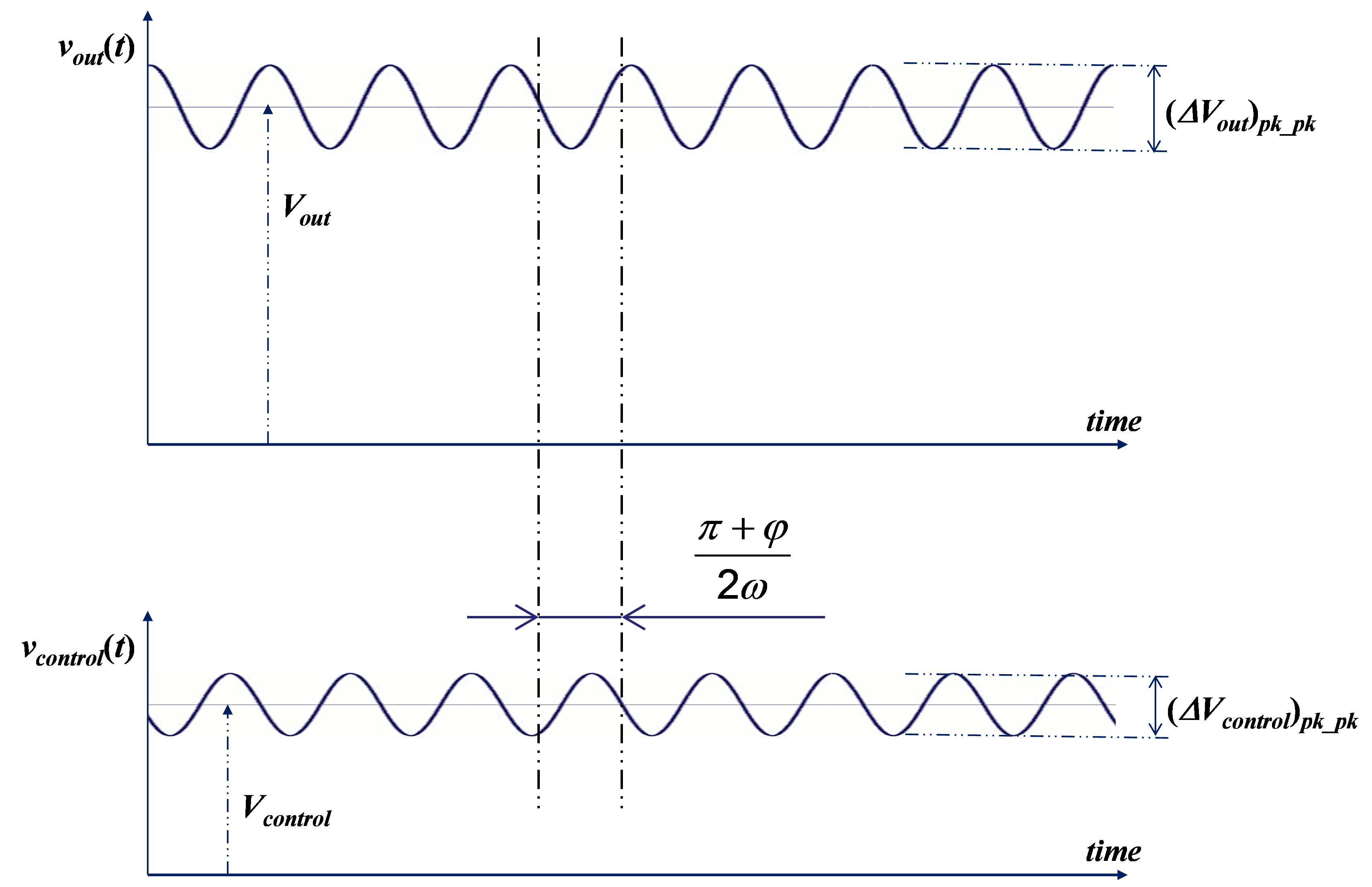 They show that the vcontrol(t)ripple provides a second fundamental component (blue term of equation (2)) that can be put in phase if the vcontrol(t)ripple is 3π/2 phase-shifted with respect to the output voltage ripple  . There is above all a third harmonic component (red term) which can only be minimized by limiting the relative part of the vcontrol(t)ripple in the control signal. The loop should hence be designed to strongly attenuate the ratio vcontrol(t)ripple over Vcontrol (vcontrol(t)dc value).