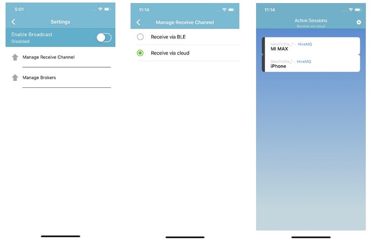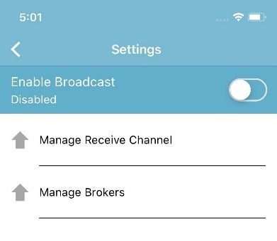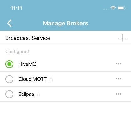 To enable broadcasting, users can simply tap the Manage Brokers link which will display a list of Default MQTT brokers. From there, the app will establish a connection using the MQTT channel for sending this data.