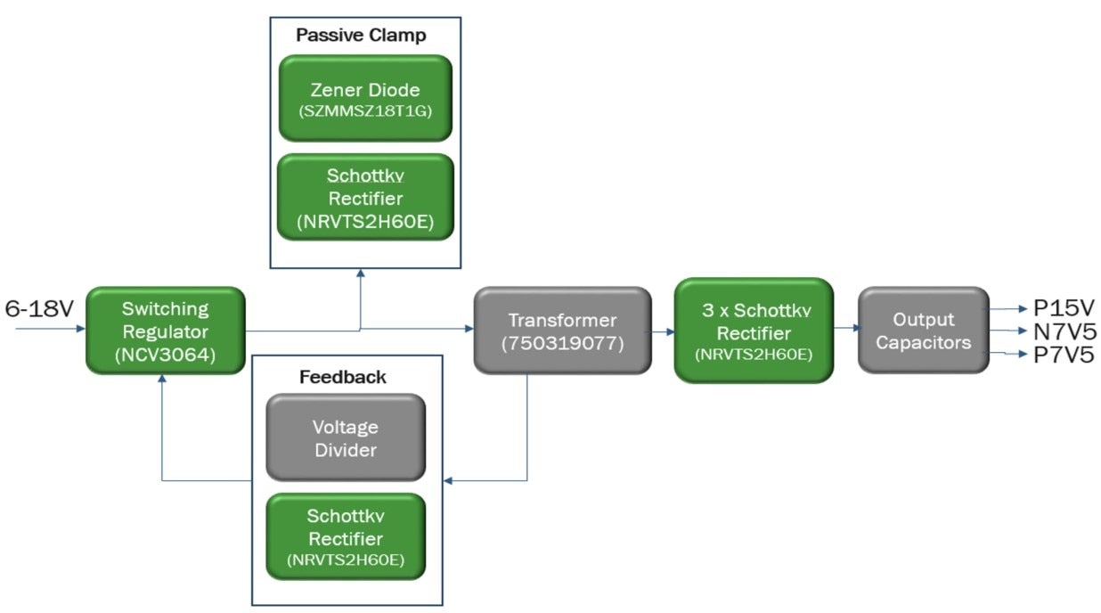 Auxiliary power supply units are ubiquitous in power applications for Battery Electrical Vehicles (BEV) and Hybrid Electrical Vehicles (HEV), and crucial for provisioning power to a wide variety of low voltage subsystems, generally up to 20 V, such as control, communications, safety, drivers, etc. Moreover, the power source for the supplies themselves might be off a high voltage +400 V DC bus, like in On-Board Charging (OBC) systems, or the 48 V or 12 V battery voltage rails. With such a broad scope of applications, the requirements for auxiliary power supplies are very diverse, spawning a myriad of alternative solutions and implementations in the market.