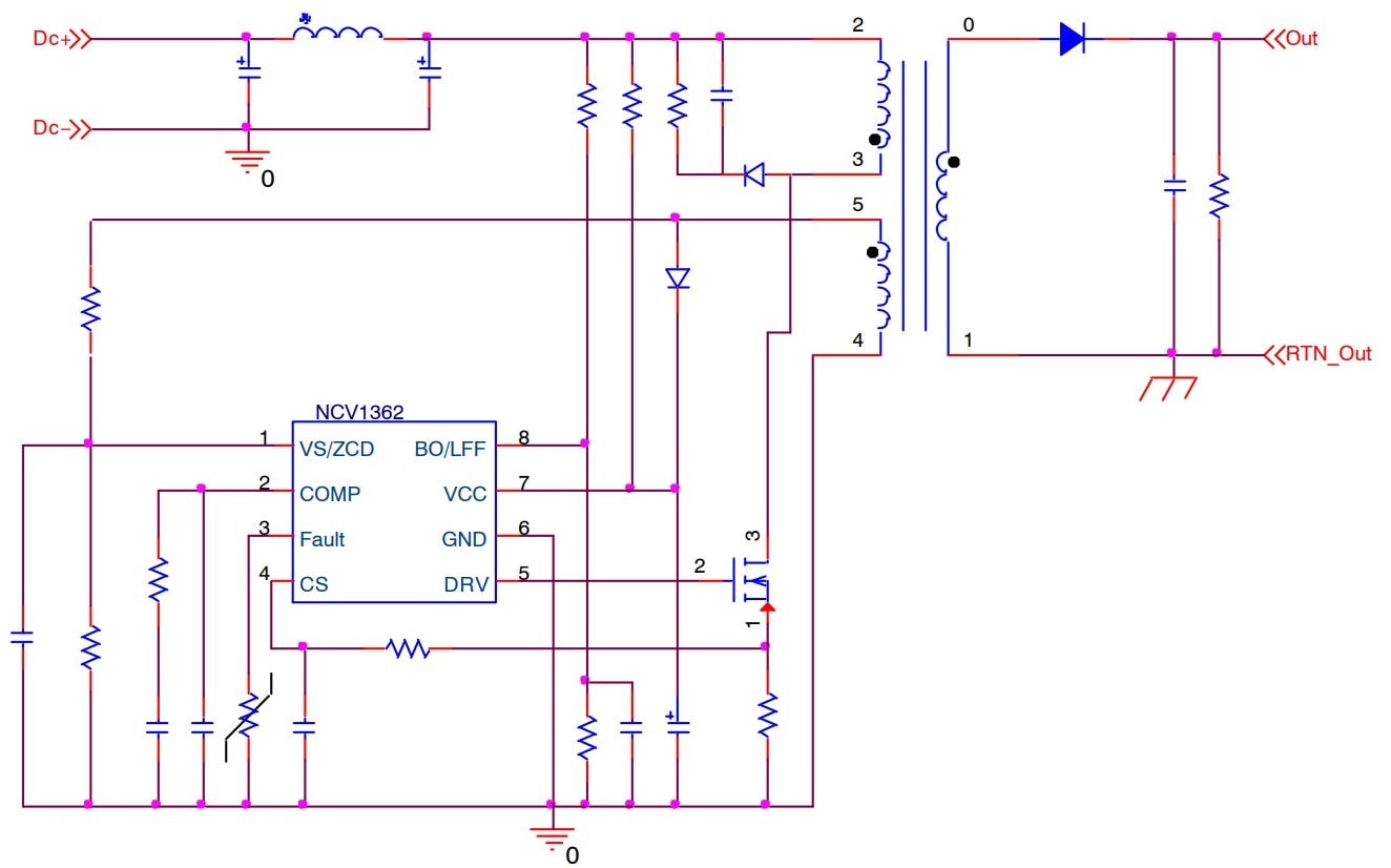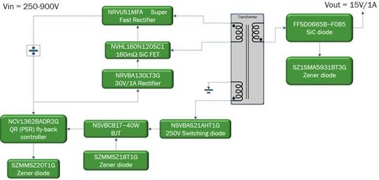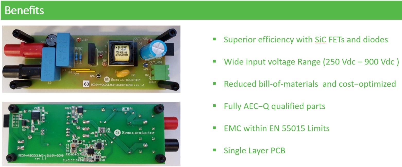 The solutions capitalize on the multiple merits of the NCV1362 quasi−resonant peak current PSR flyback controller together with cost−optimized NVHL160N120SC1 160 mΩ 1200 V silicon carbide (SiC) MOSFET, and the FFSD0665B−F085 SiC diode. Thanks to the high blocking voltage capabilities and ultra−low gate charge (34 nC) value of the SiC FET, the switching losses are significantly shrunk, and the designs exhibit a superior efficiency for the application with up to 86% in low line conditions. The remarkable driving capabilities of the NCV1362 controller allows for direct operation of the SiC FET at 12 V without a pre−driver, simplifying the layout and cutting down the bill-of-materials content. The flyback transformer provides 4 kV isolation and is fully realized with automotive-qualified semiconductors and passive devices.