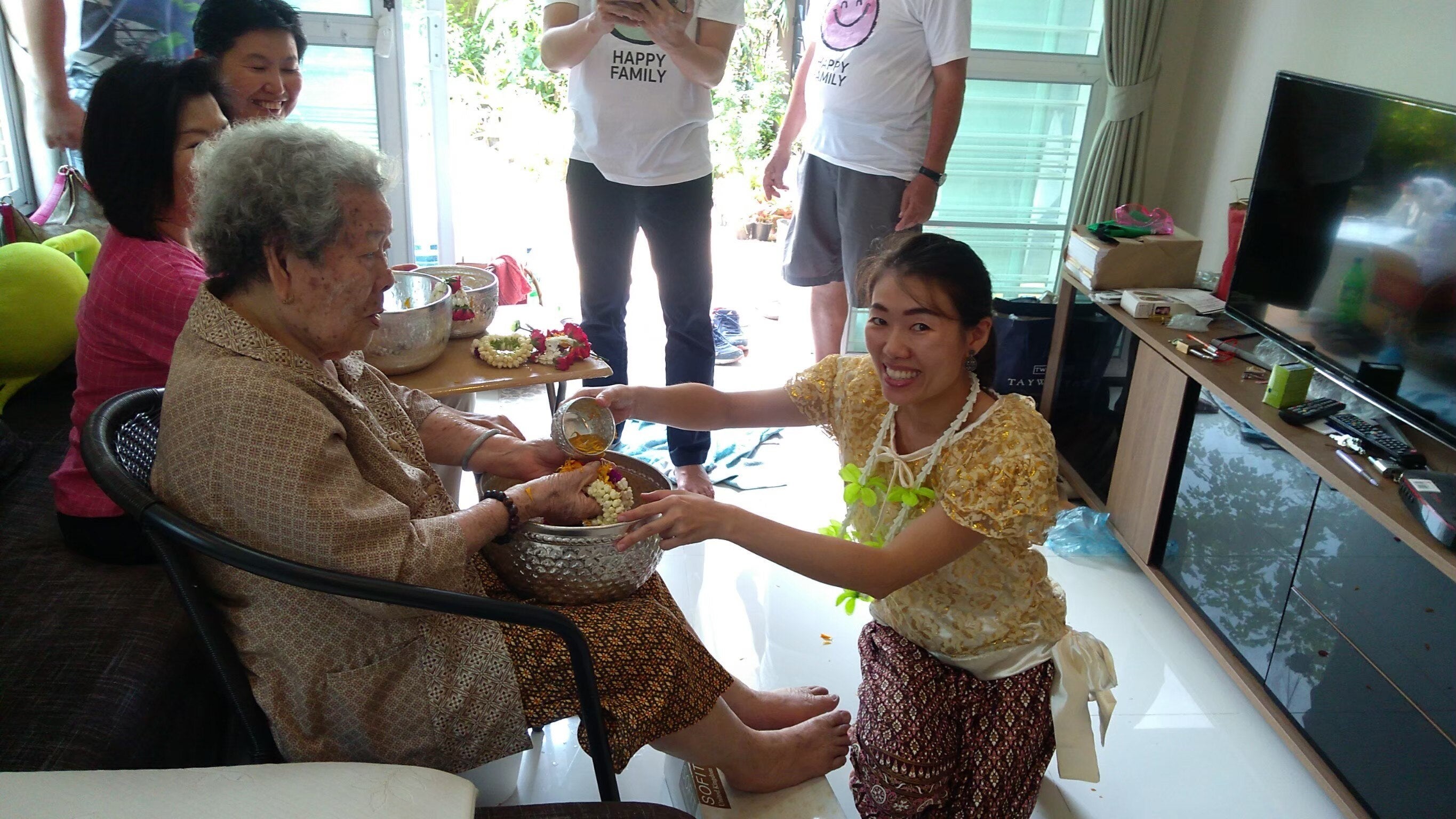 Nuchjavitthayaporn is blessing a female family member by pouring water over her hands.
