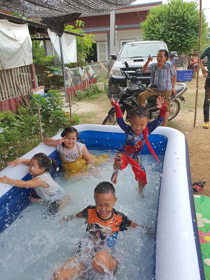 Sathienett celebrating Songkran with family as the kids play and enjoy the water.