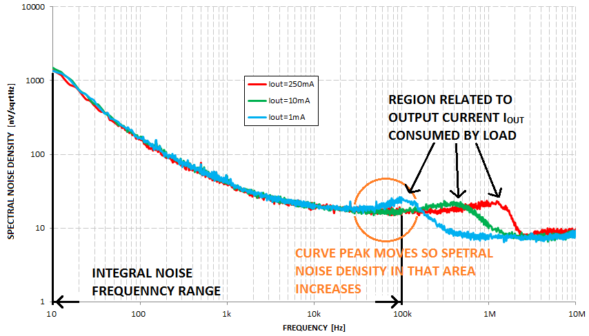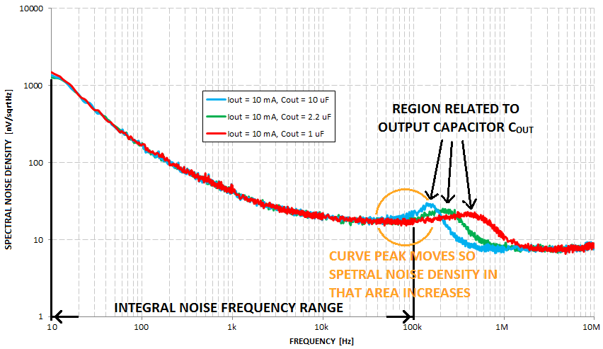 LDO输出端的噪声也与负载有关。负载消耗电流Iout,该电流值等于电阻RLOAD。与负载相关的是多个RLOAD和输出电容COUT。较高的RLOAD值或较高的COUT值意味着与负载相关的曲线部分向较低频率移动。在上面的图片上,您可看到与IOUT有关,在下面的图片中,您可看到与COUT有关。