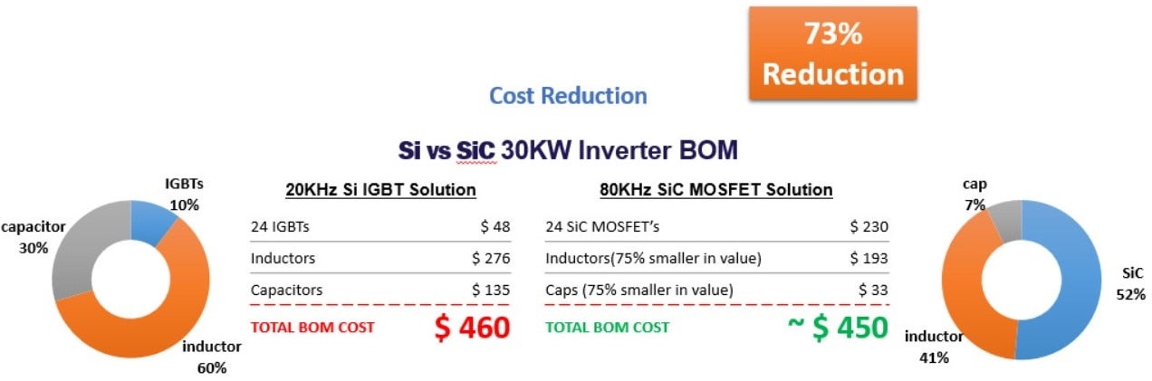 如果有因素减缓了WBG的采用,那么从过去而言这因素就是成本。但是,粗略的分析将使工程师得出错误的结论,因为半导体器件通常仅占电力系统成本的10%,而电感器和电容器约占90%。由于SiC器件增强的性能,可使电容器和电感器的值降低约75%,从而极大地降低了成本和尺寸。