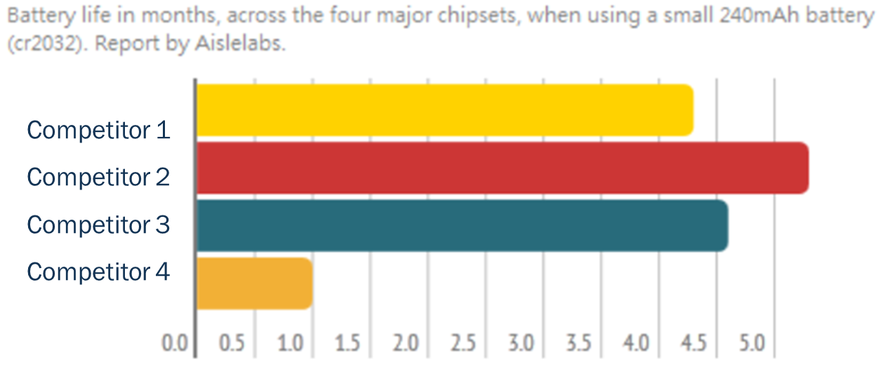 2015 年のBluetooth タグ市場は、22 社のメーカーから約26 機種が発売された黎明期にありました。その時点でアイルラボ(Aislelabs)社が、それらのデバイスそれぞれの技術ベンチマークを発表しました。その結論は、彼らの特定のテスト条件とCR2032 バッテリの下でのバッテリの寿命は、デバイスメーカーとシリコンチップセットのベンダーに依りますが、4~5ヶ月が限界であるというものでした。