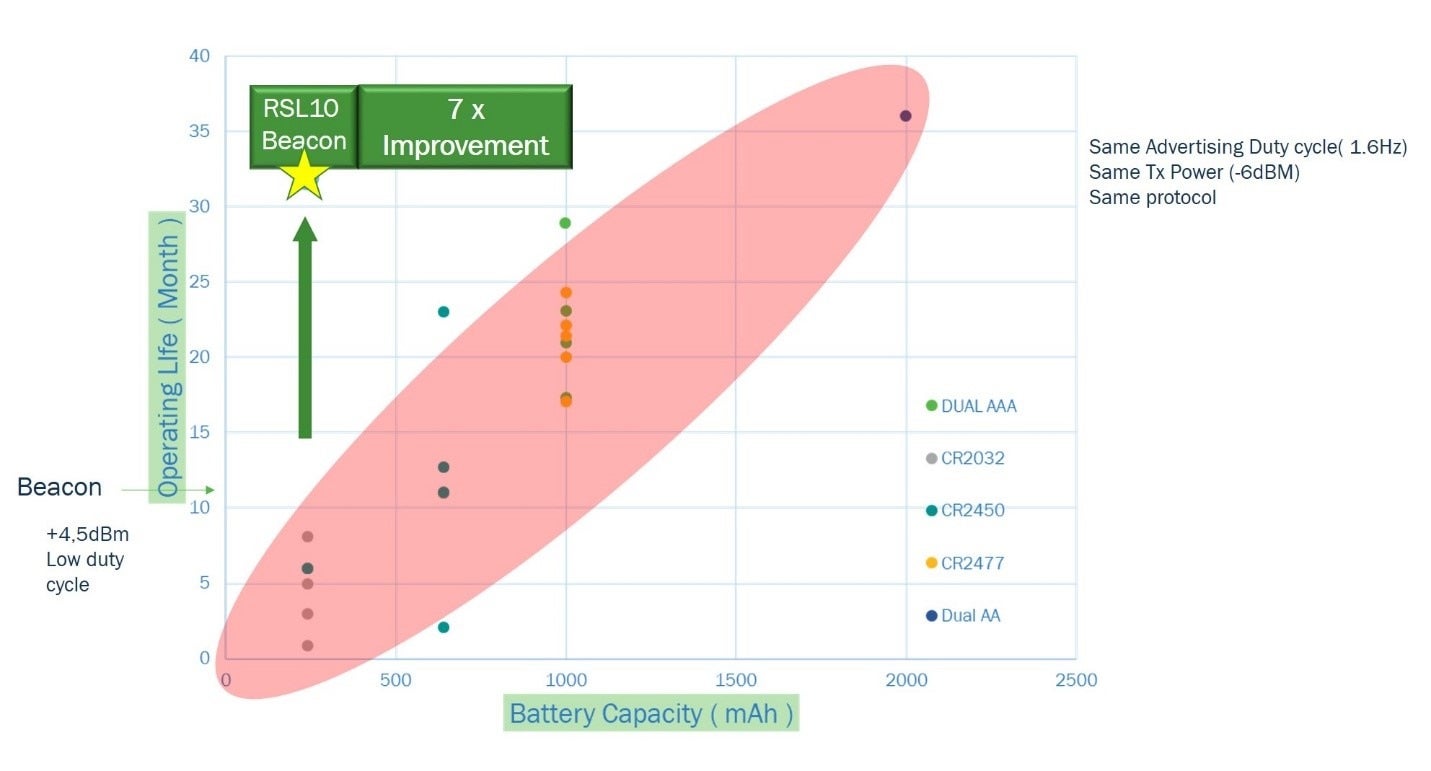 図4. RSL10 を用いたビーコンのバッテリ寿命の向上(データ:アイルラボ社