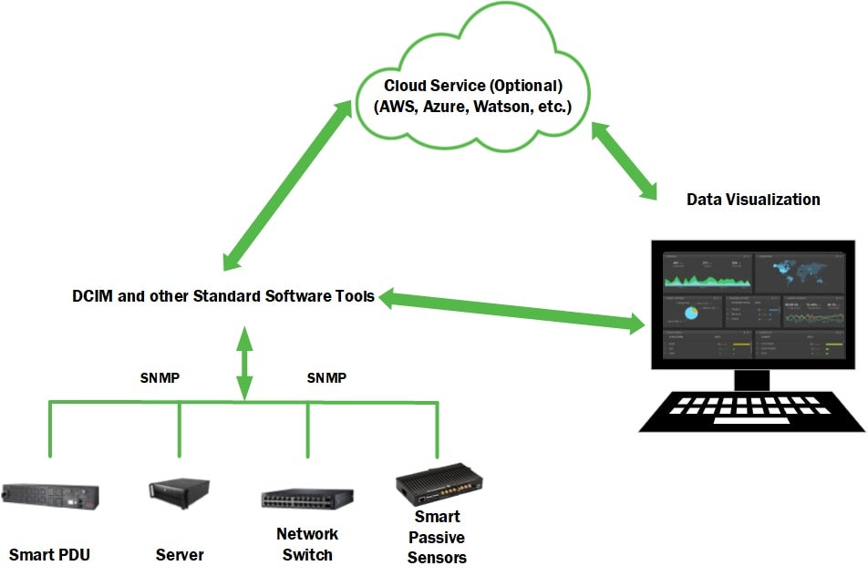 传感器数据由DCIM工具通过标准SNMP接口访问,该接口还用于访问数据中心内的智能配电单元(PDU)、机架服务器、网络交换机和其他设备的数据。SPS系统只是DCIM工具集成到现有分析工具中的另一个数据源。下图显示了SPS系统通常如何通过SNMP接口集成到现有数据中心管理系统。